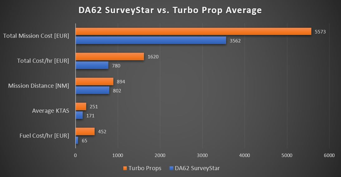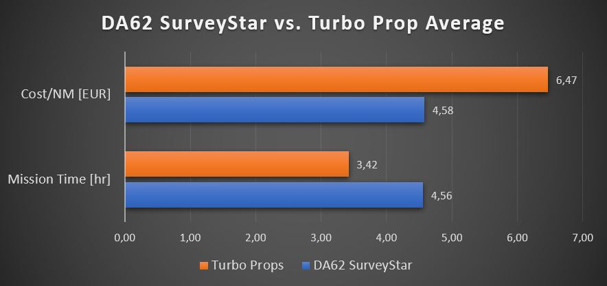 The wide speed range between 90 – 195 kts, allows for a very versatile utilization of the aircraft. It can be used for low and slow missions, that are normally flown by piston airplanes, but also for high and faster missions that may be flown by turbine powered platforms. The DA62 SurveyStar performs all missions more cost efficient and environmentally friendly in terms of emissions and noise (see comparison charts).